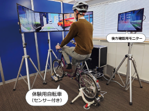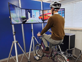 実際の自転車にセンサーを装着し、コントローラーとして使用するシステムです。ペダルをこぐと、3D映像で再現された街なかを走行することができ、リアルな運転体験が可能です。走行中には、典型的な自転車事故が発生するさまざまな交通場面を再現。出現する歩行者、自転車、自動車などリアルな挙動を通して安全運転の重要性を学ぶことができます。